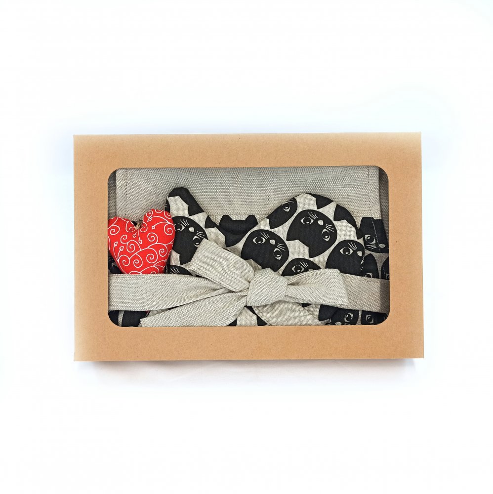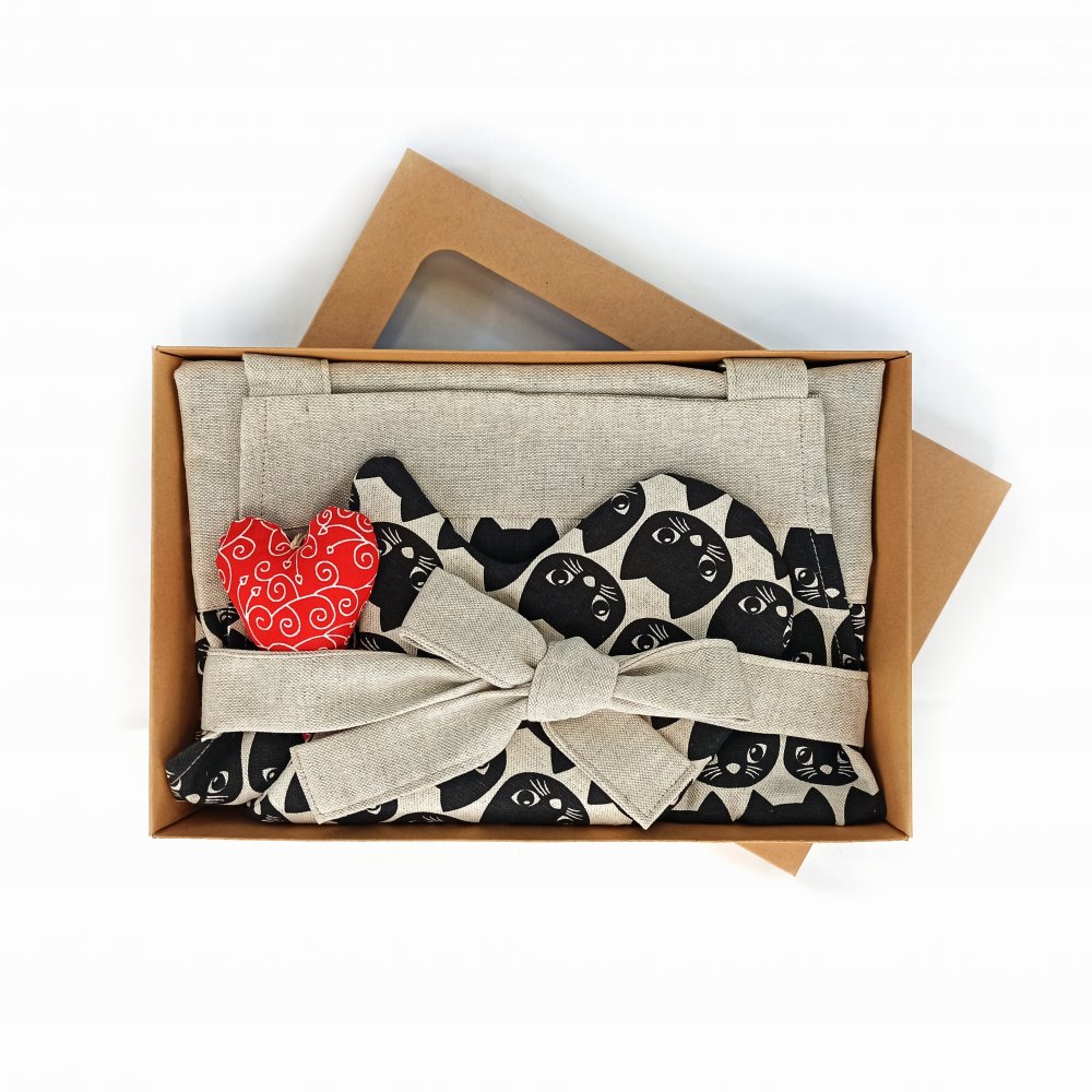 Dárková sada Zástěra + chňapky KOČKY obsahuje zástěru, dvě chňapky pro dospělé a drobnou dekoraci.