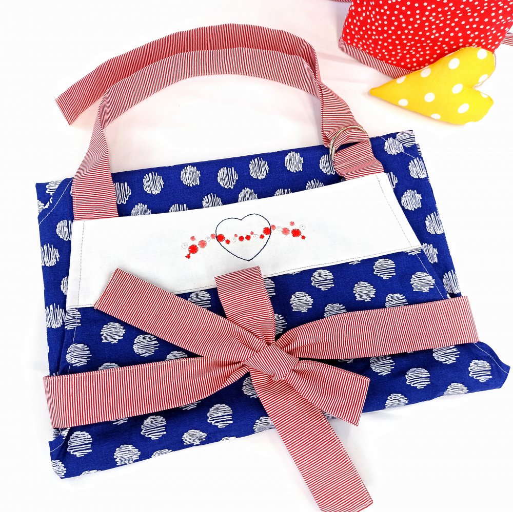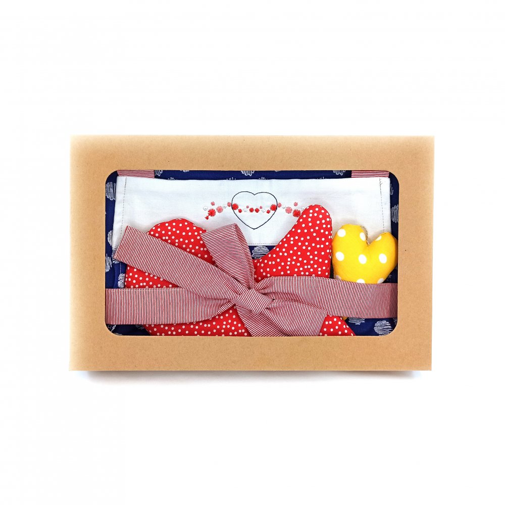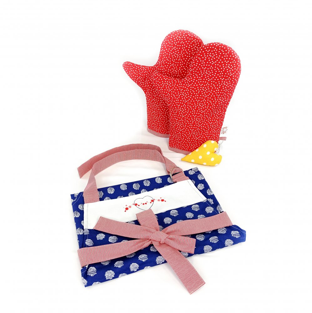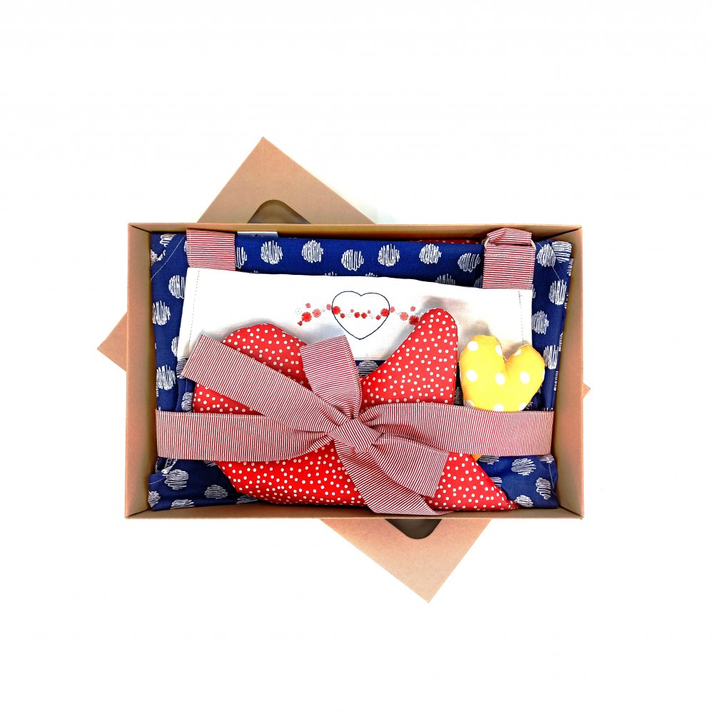 Dárková sada Zástěra + chňapky MODROTISK DOT s výšivkou obsahuje zástěru, dvě chňapky pro dospělé a drobnou dekoraci.