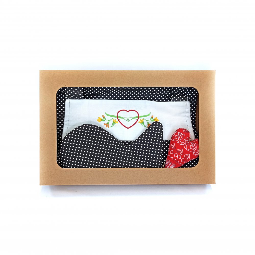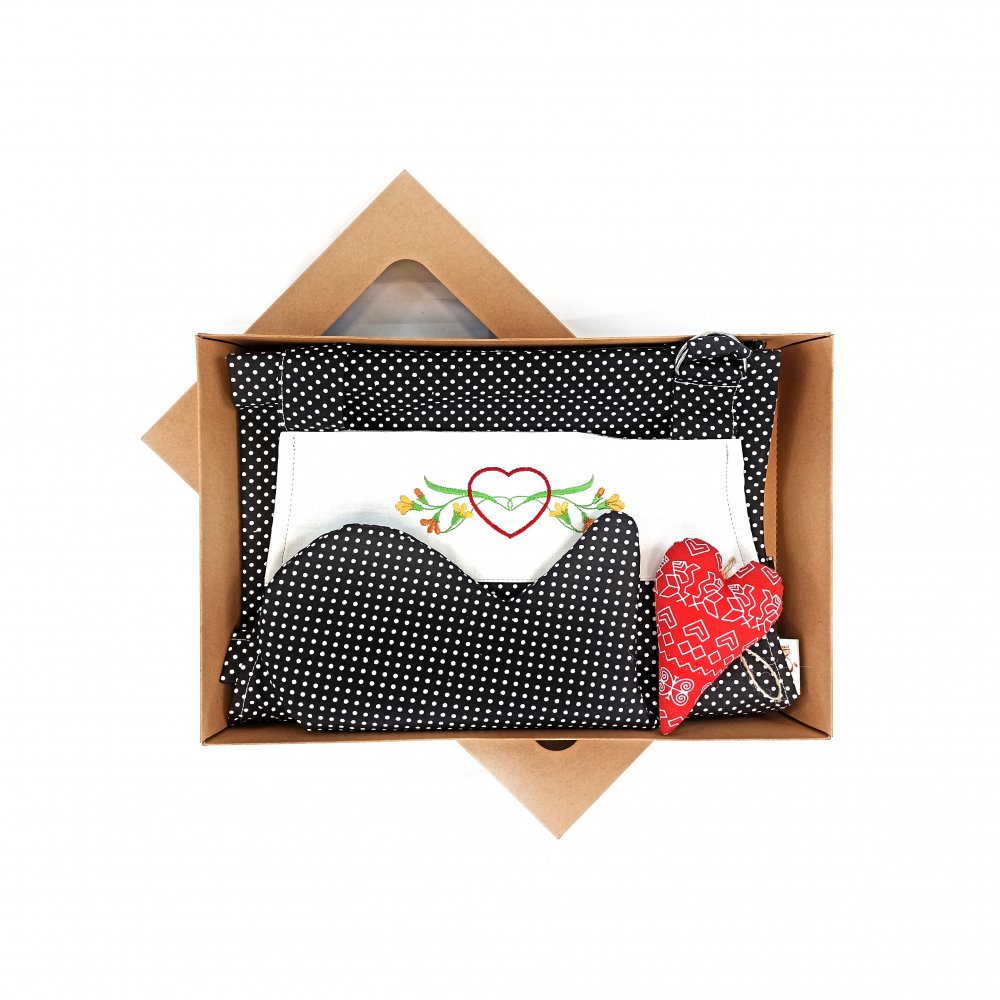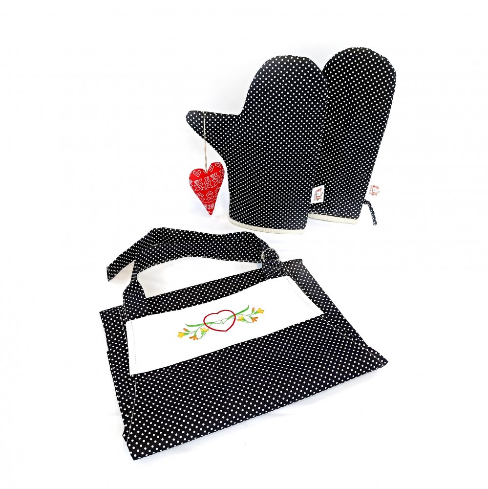 Dárková sada Zástěra + chňapky PUNTÍK BW s výšivkou obsahuje zástěru, dvě chňapky pro dospělé a drobnou dekoraci.