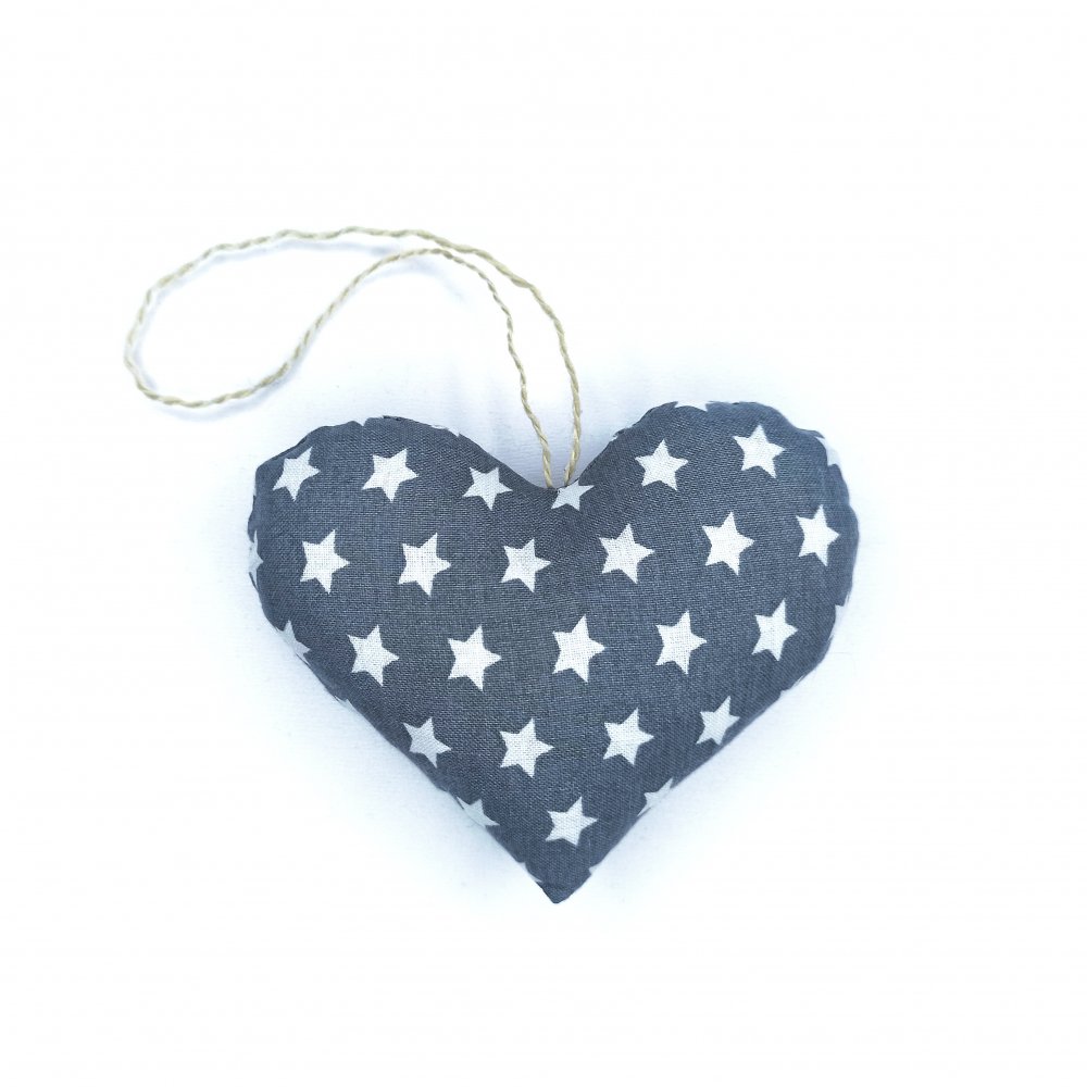 Dekorace Srdíčko Hvězdičky na šedé šijeme z bavlněného plátna a plníme antialergenním dutým vláknem.