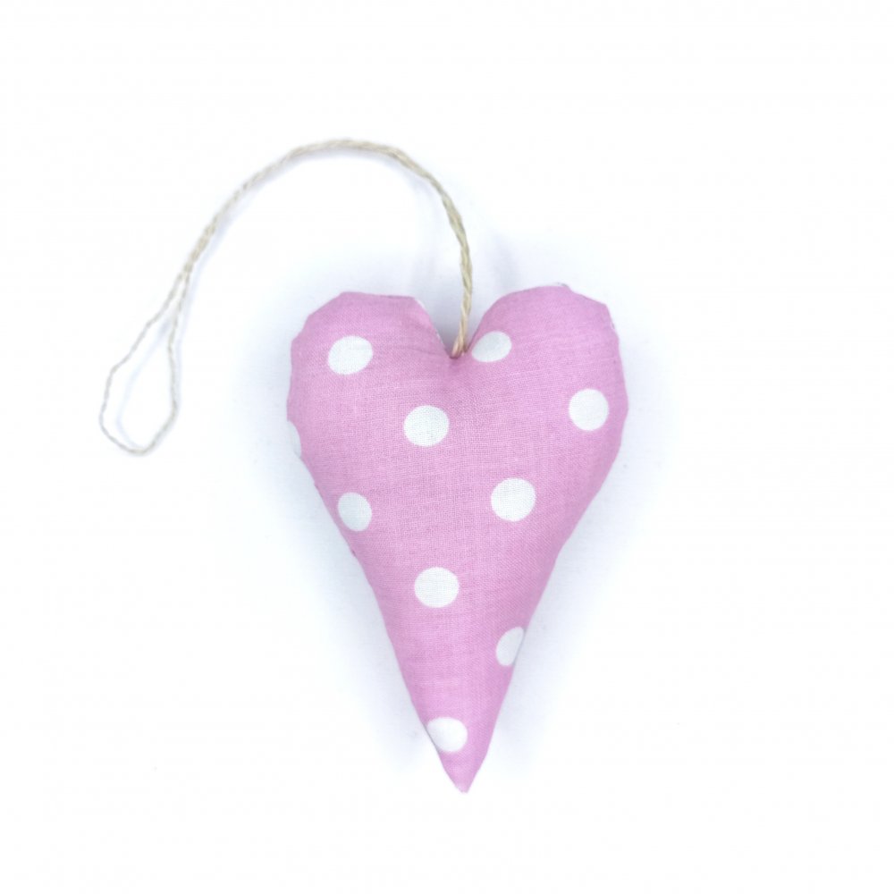 Dekorace Srdíčko Puntíky na růžové šijeme z bavlněného plátna a plníme antialergenním dutým vláknem.