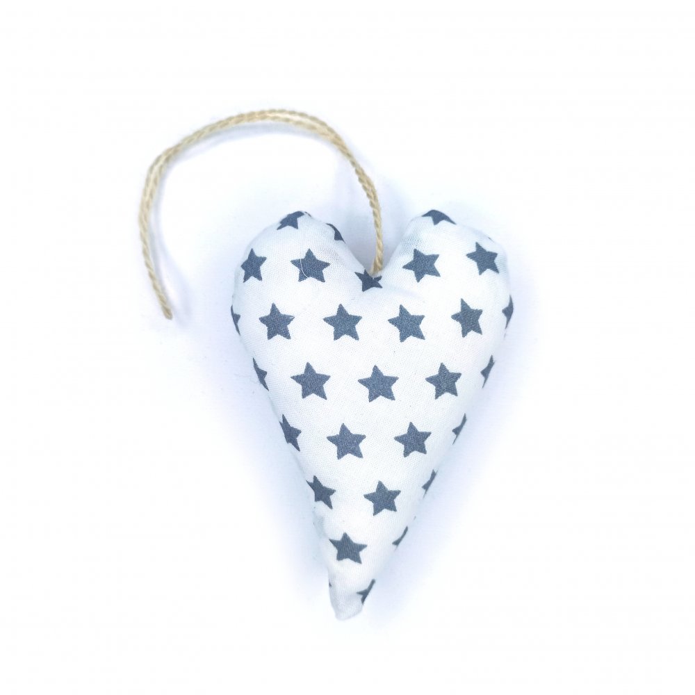 Dekorace Srdíčko Šedé hvezdičky šijeme z bavlněného plátna a plníme antialergenním dutým vláknem.