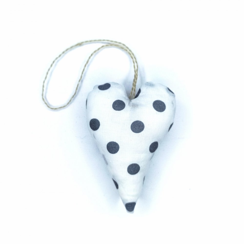 Dekorace Srdíčko Šedé puntíky šijeme z bavlněného plátna a plníme antialergenním dutým vláknem.