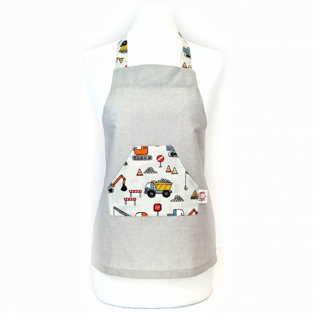 Dětská zástěrka Šedá s auty je vyrobená z bavlněných pláten.