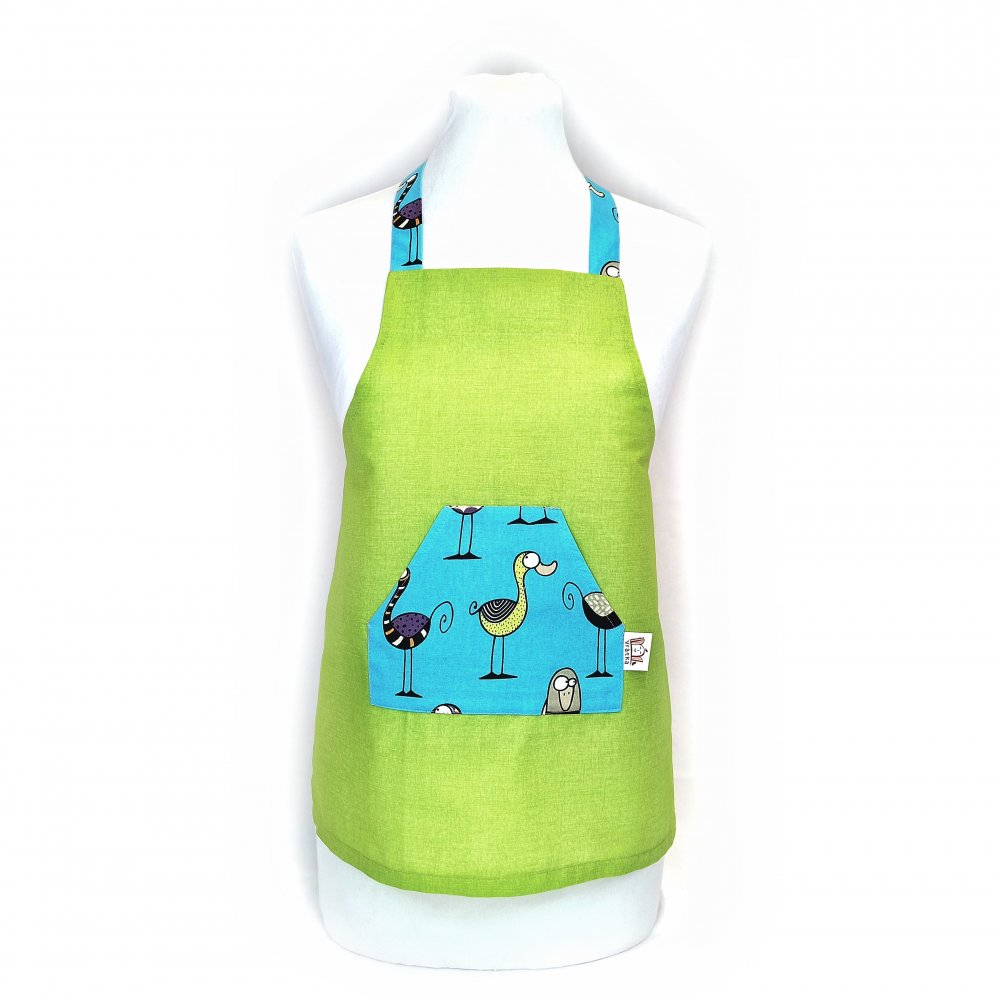 Dětská zástěrka Zelená s ptáčky je vyrobená z bavlněných pláten.