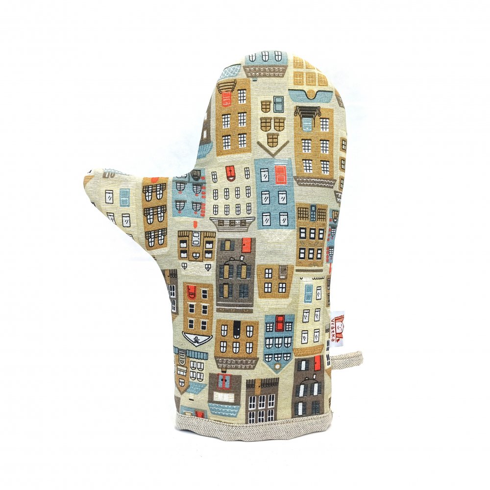 Kuchyňská chňapka Domky je ušitá ze směsové látky vyšší gramáže.