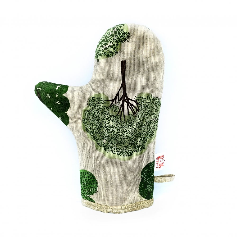 Kuchyňská chňapka Stromy je ušitá ze směsové látky vyšší gramáže.