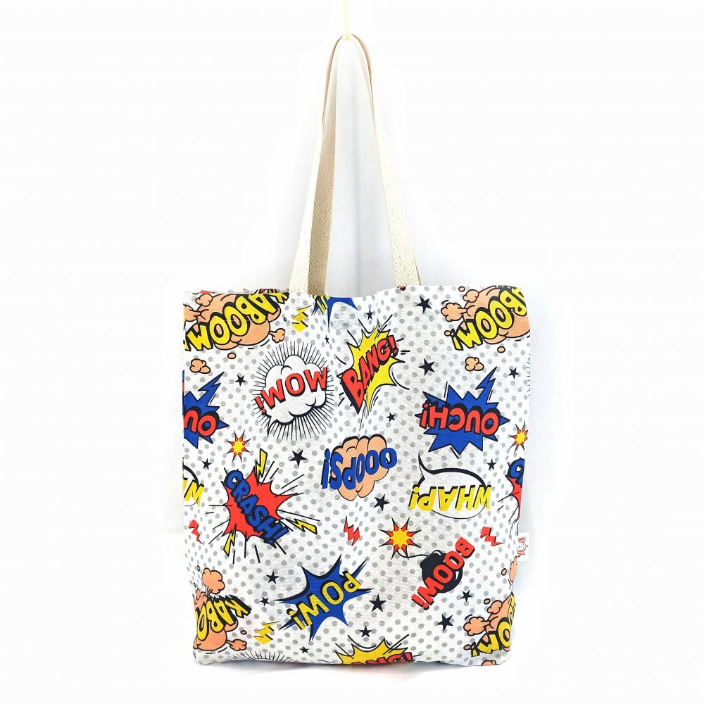 Nákupka Komiks bílý je ušitá ze směsové textilie bavlněného vzhledu.