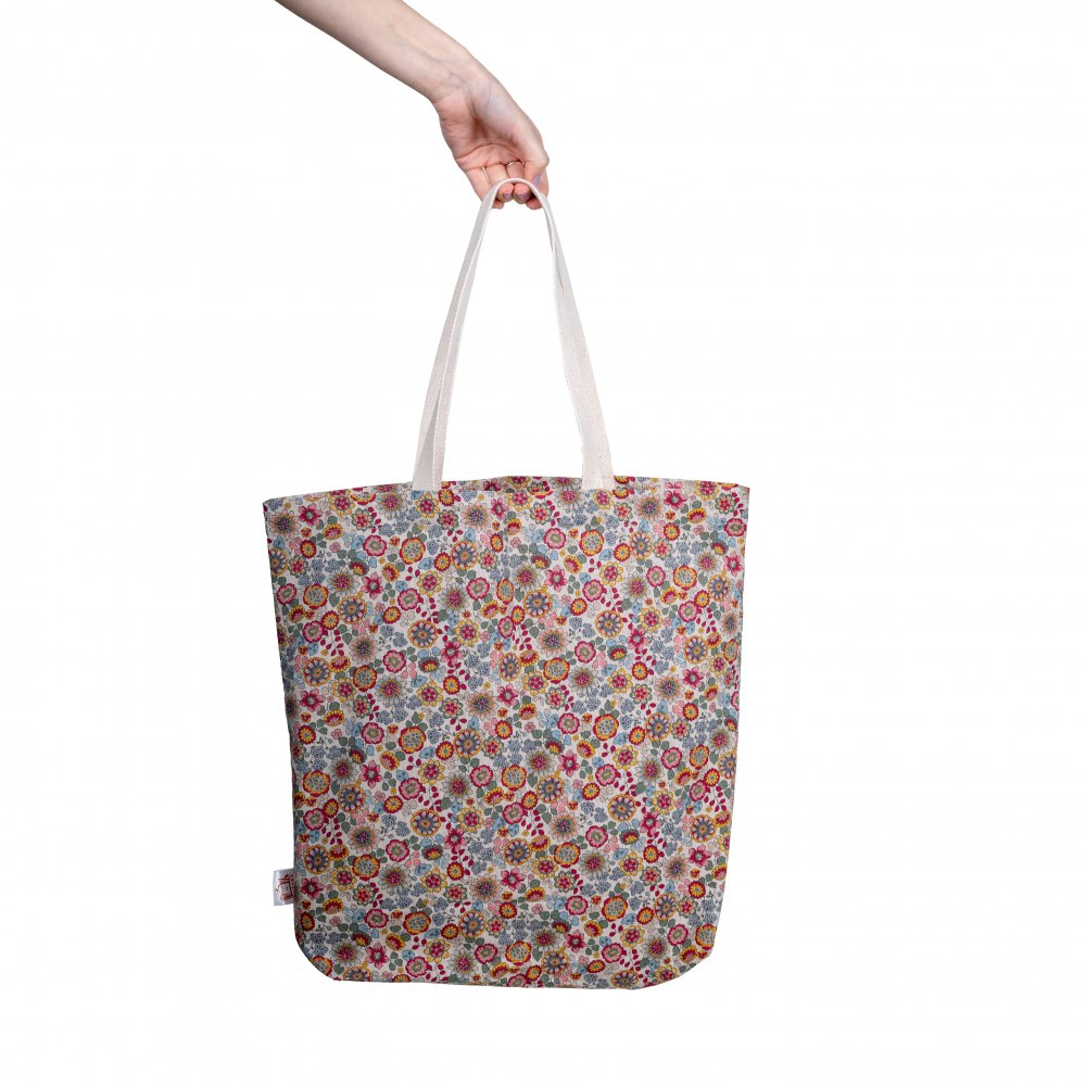 Nákupka Kytičky na režné je ušitá ze směsové textilie lněného vzhledu.