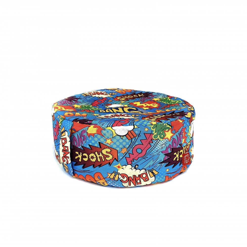 Pohankový sedák Komiks modrý je ušitý ze směsové textilie vyšší gramáže.