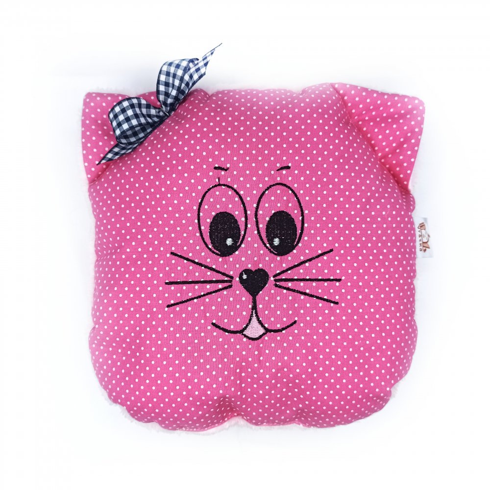 Dětský polštářek Kočička Růženka je vyrobený z bavlněného plátna a hebkého mikroplyše (zadní strana).