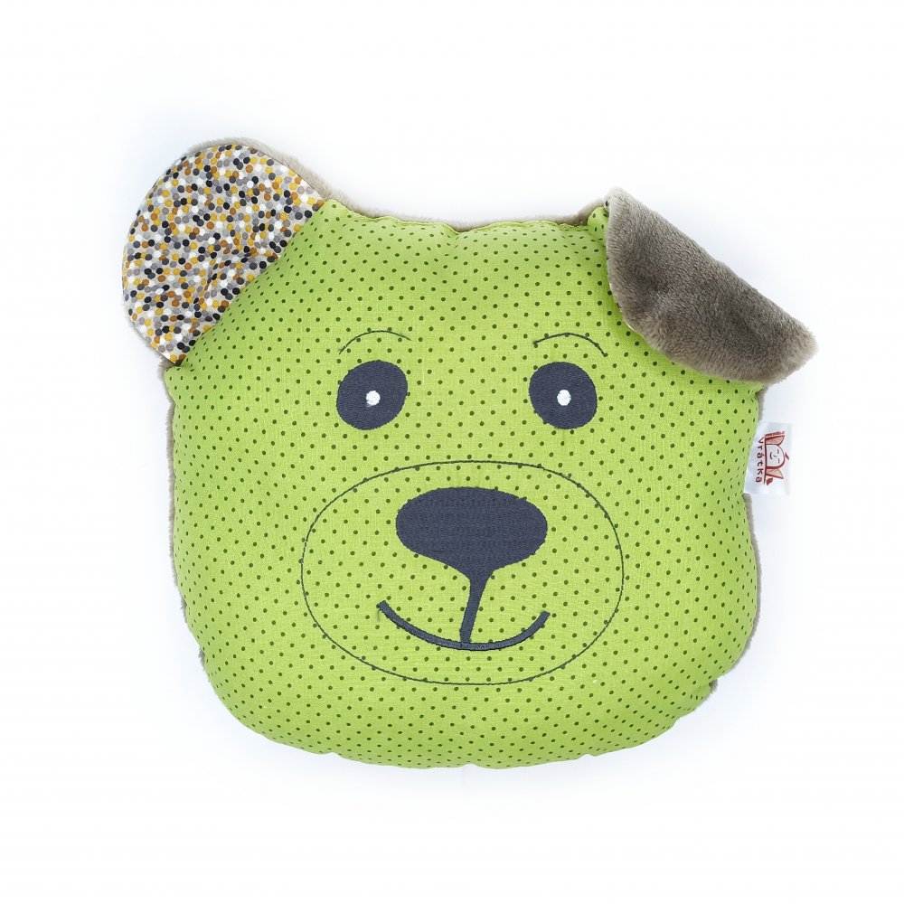 Dětský polštářek Méďa Béďa je vyrobený z bavlněného plátna a hebkého mikroplyše (zadní strana).