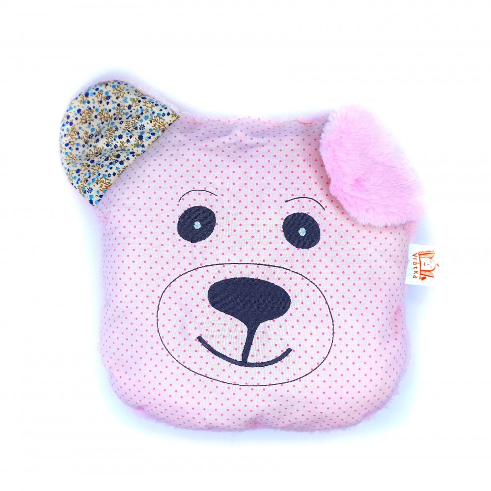 Dětský polštářek Méďa Cukřík je vyrobený z bavlněného plátna a hebkého mikroplyše (zadní strana).