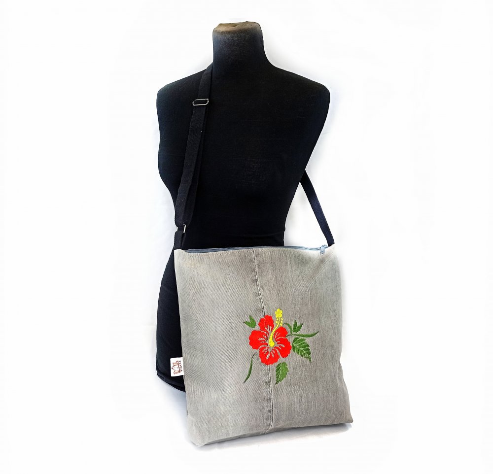 RECYklovaná kabelka Ibišek je vyrobená z darovaných šedobéžových riflí.