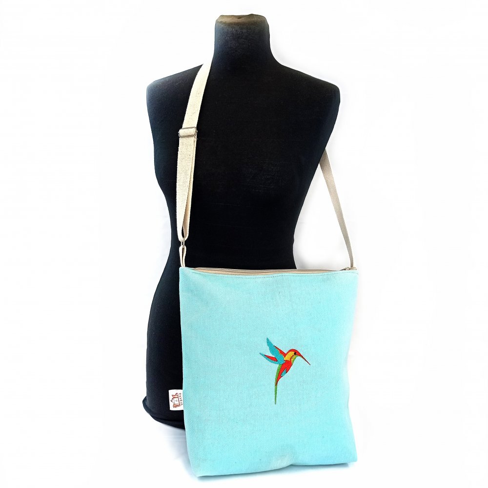 RECYklovaná kabelka Kolibřík je vyrobená z darovaného zbytku nepotřebné azurové rifloviny.