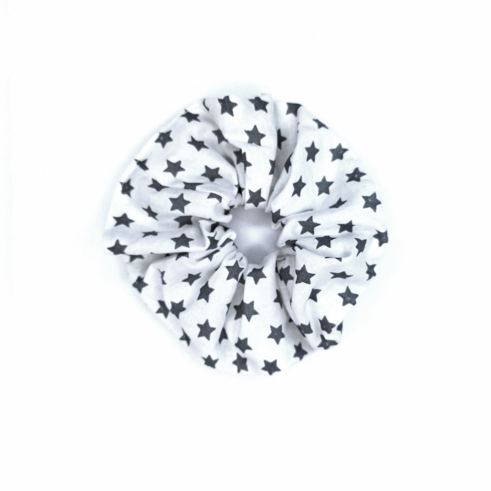Scrunchie gumička Hvězdičky na bílé je vyrobená z bavlněného plátna.