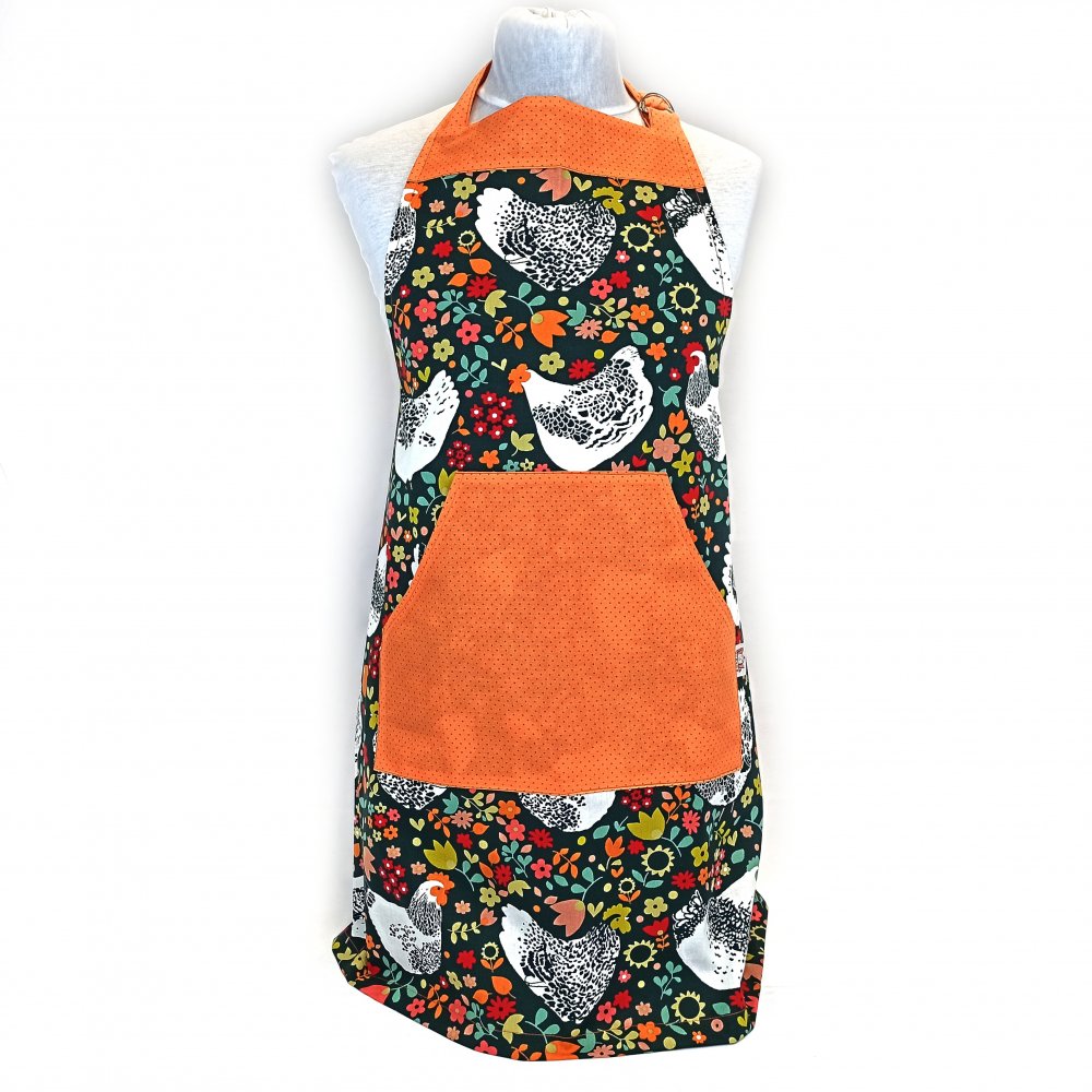 Zástěra Slepice je vyrobená ze bavlněného plátna s výrazným vzorem.